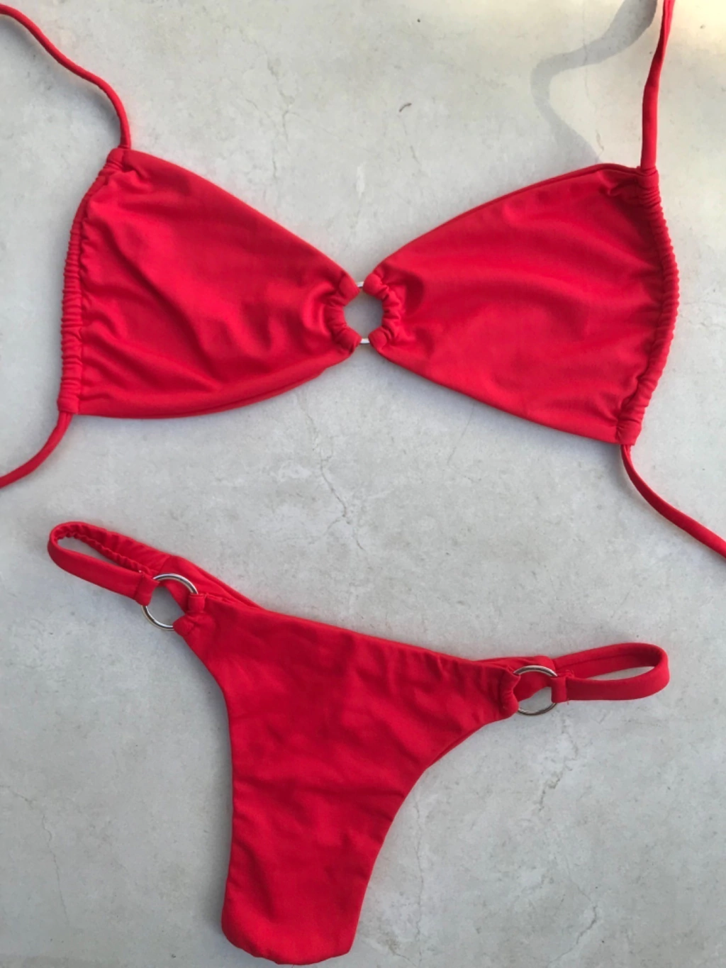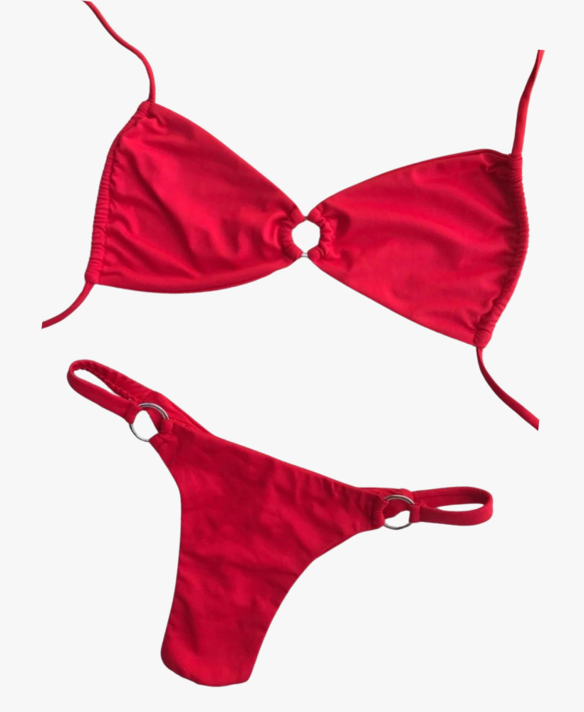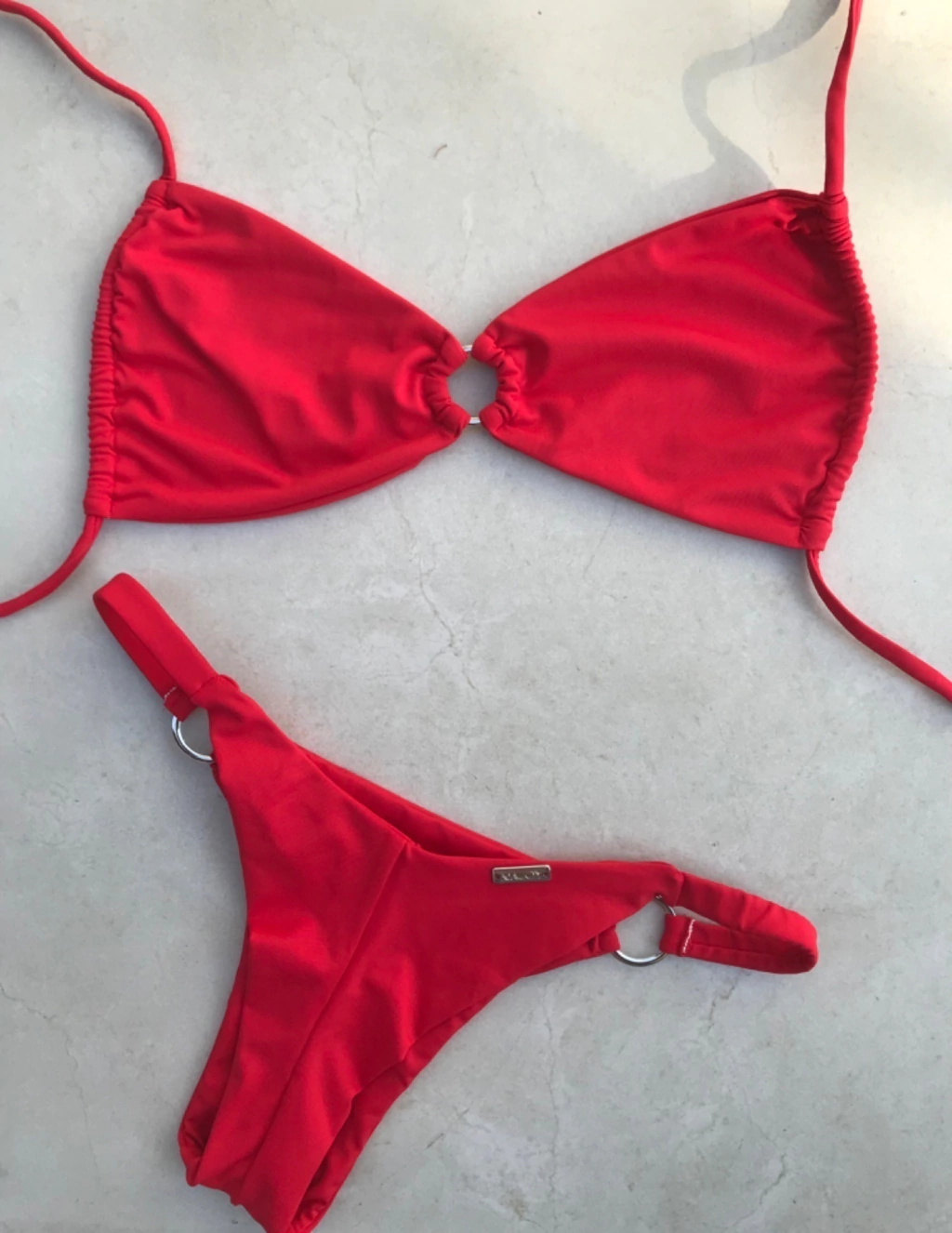 Top com argola no meio do busto, regulagem nas alças e amarração nas costas.