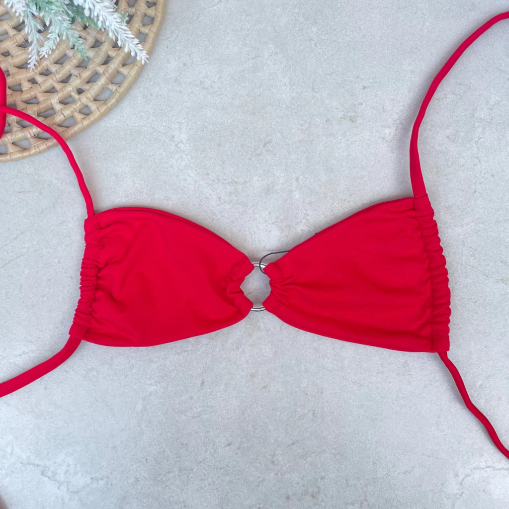 O top luna tem uma argola central de metal, proprio para moda praia, e as tiras são